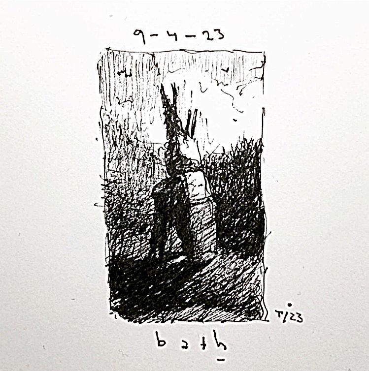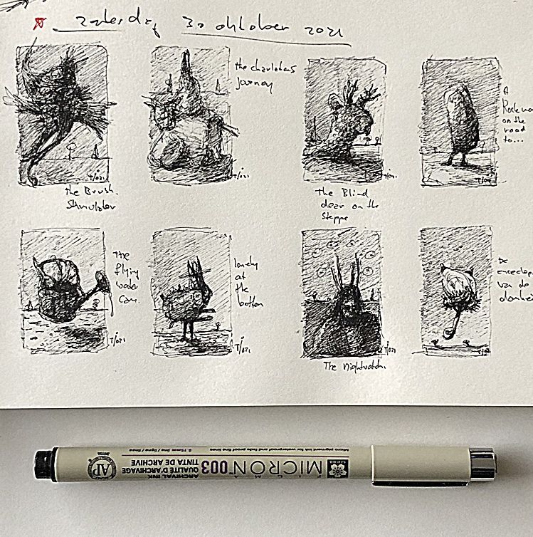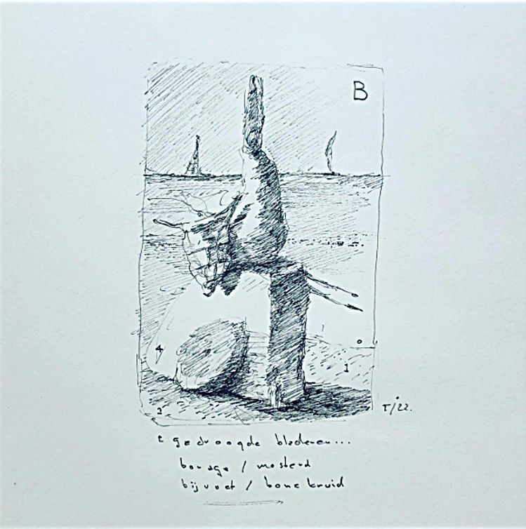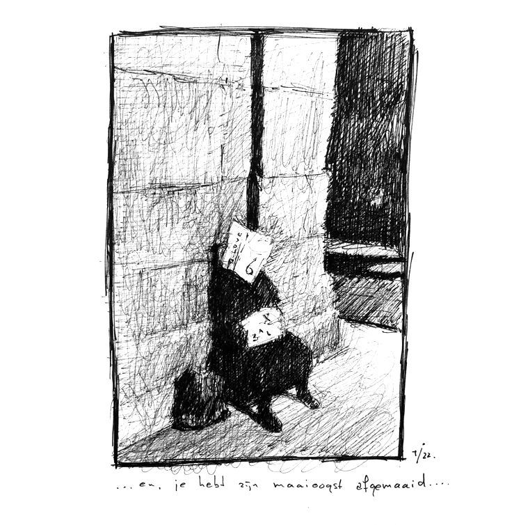 Dit tekenwerk is een projectie van eerder gemaakte schetsen. Deze schetsen ontstonden zaterdag 30 Oktober 2021 tijdens het schrijven in mijn dagboek. Zo werd er op die dag een nieuw concept geboren, bestaande uit 8 werkjes van 2,5 X3,5 cm. Deze kleine tekeningetjes (gemaakt met een fineliner) vormden de basis voor een verdere tekenstijl die doorgaat tot op de huidige dag. Middels een projector heb ik deze allereerste schetsen uitvergroot, maar ditmaal heb ik ze met een parker balpen op papier gezet. Dit alles met het idee om de authenticiteit van het originele werk te behouden. Daarnaast zijn er bijbelse elementen gebruikt, dit in lijn met de vroegere schilderkunst waarin symboliek een grote rol speelde. ''Uit voorraad geplukt'' is vernoemd naar een uitspraak van mijn vader aan wie ik deze serie dan ook opdraag.